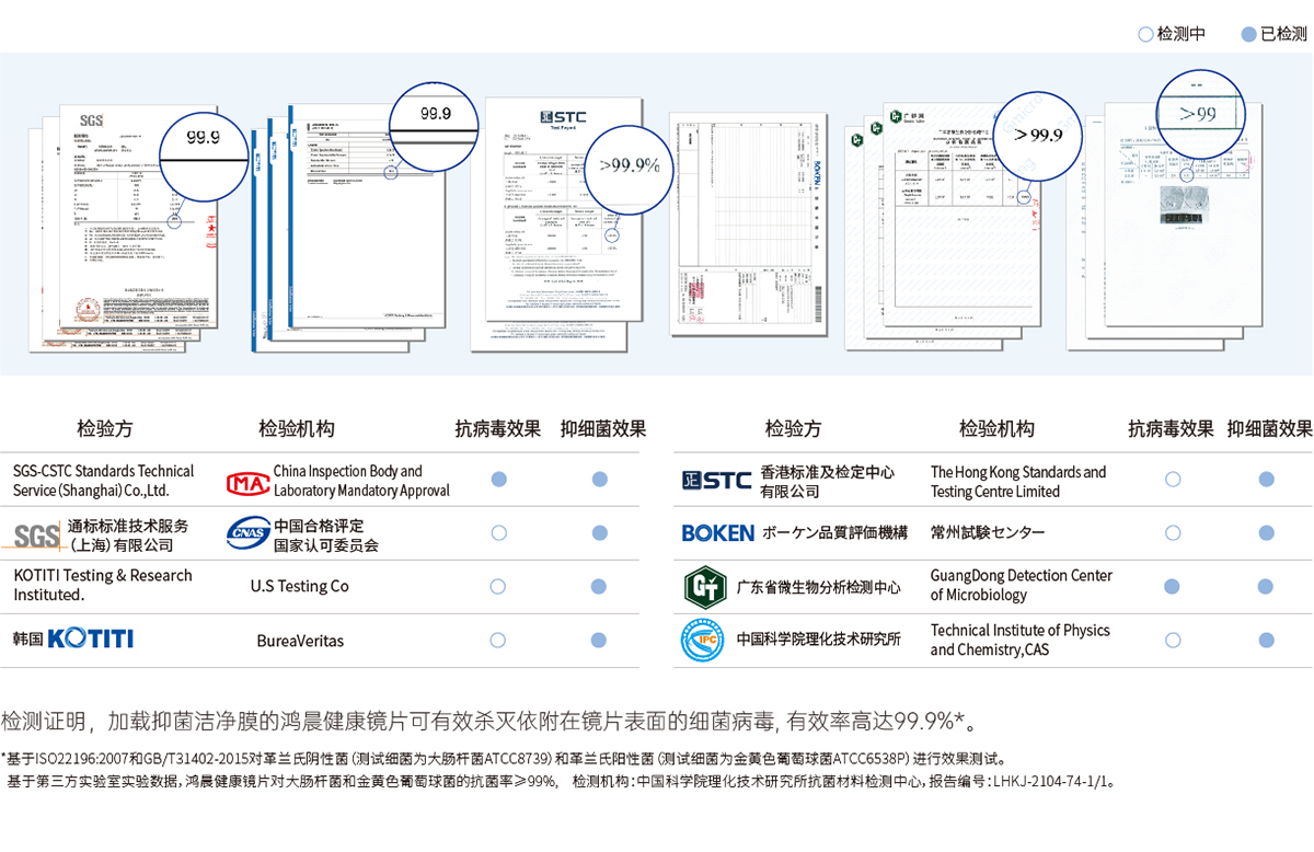 實(shí)驗(yàn)證明:鴻晨健康鏡片有效滅活細(xì)菌病毒≥99%